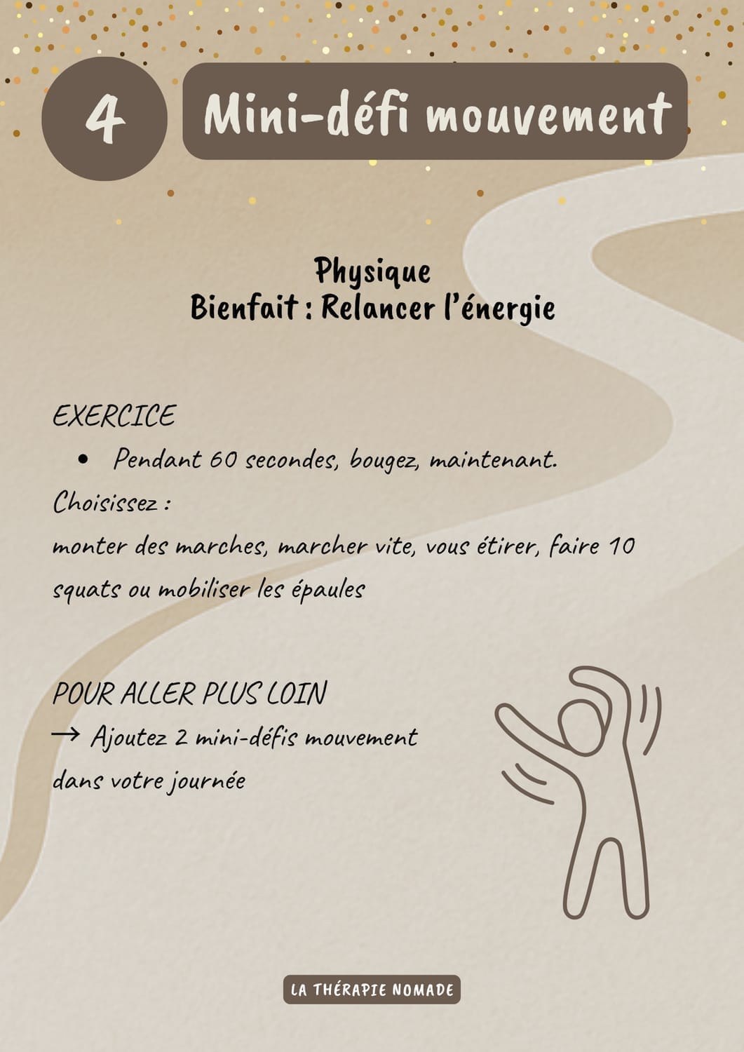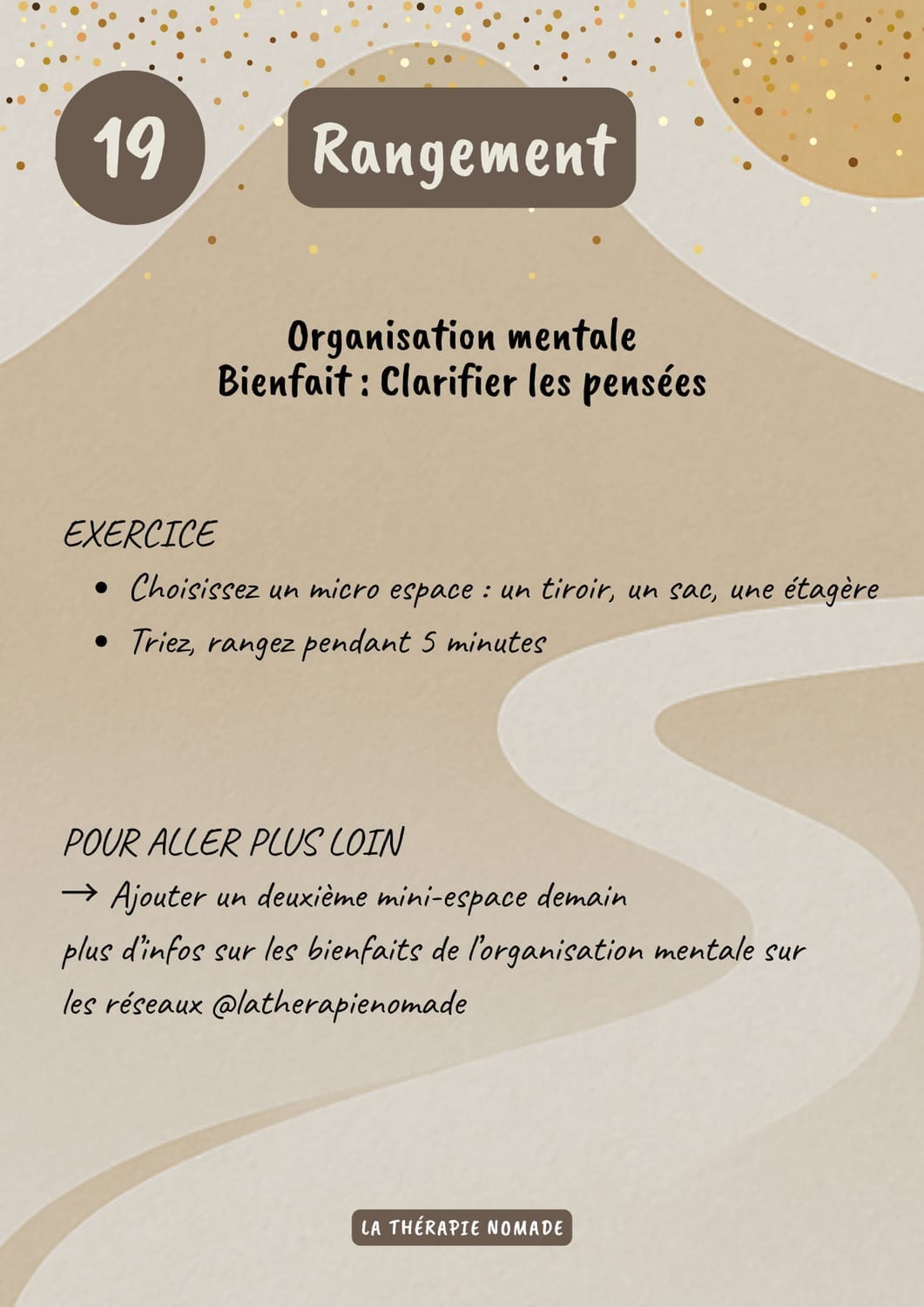 Vous pouvez suivre le rythme quotidien, une case par jour ou avancer à votre façon. Vous pouvez, évidemment, répétez les cases à votre convenance.